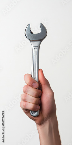 hand firmly holding a metallic wrench against a plain white background. The wrench is shiny and industrial, symbolizing tools, mechanics, and repair work, with a minimal and clean presentation