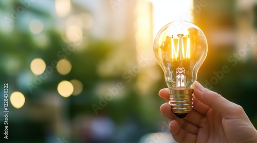 Hand gently gripping glowing light bulb, blurred green landscape signaling innovative renewable energy concept representing sustainable technological advancement