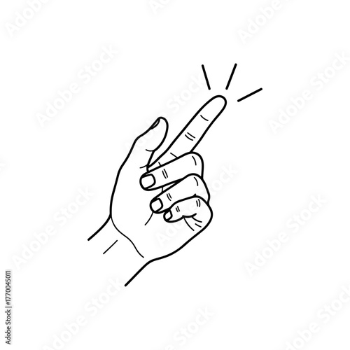 Hand gesture pointing with index finger with radiating lines indicating emphasis or a new idea, isolated on white background, line art illustration