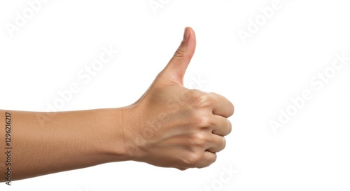 Hand gesture, thumbs up, positive approval, skin texture, isolated on white background, studio lighting, closeup photography, human anatomy