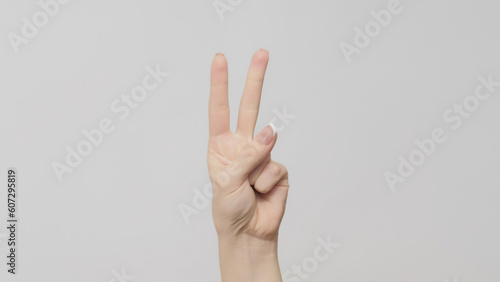 Hand gesture. Two number. Woman counting double fingers up on light gray background.