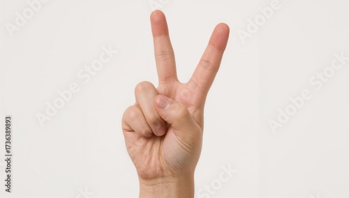 Hand gesturing the peace sign with neutral background, conveying hope and positivity for global unity and successful negotiations in business settings