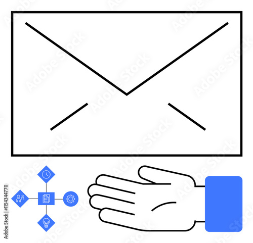 Hand giving large envelope. Icons around indicate connectivity, security, gear settings, and data exchange. Ideal for communication, technology, email services, data protection business delivery