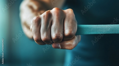 Hand gripping physical therapy band during rehabilitation exercise at a gym session.
