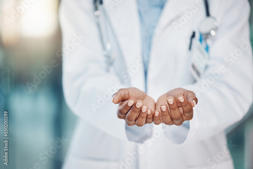 Hand, healthcare and mockup with the hands of a woman doctor holding space for marketing and advertising. Medicine, medical and product with a female surgeon in a hospital for health and wellness