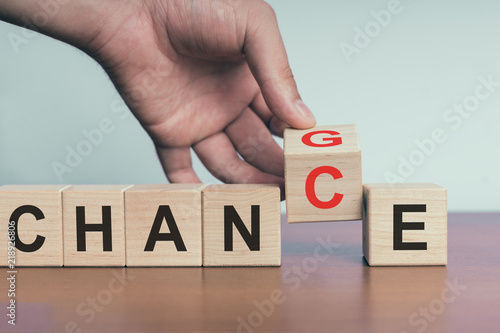 Hand hold flip wooden cube with word "change" to "chance"