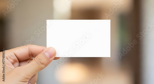 Hand holding a blank white business card with a soft focus background of neutral tones image