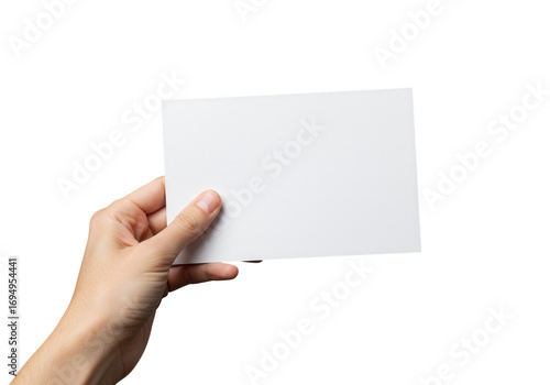Hand holding a blank white card for text or design on a dark background isolated on transparent background