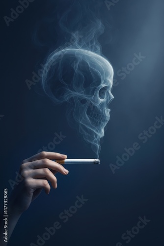 Hand holding a burning cigarette with smoke forming a skull on dark blue background. Smoking, tobacco, health hazard, addiction, anti-smoking concept. Image with copy space