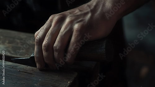 Hand Holding a Chisel on Wood