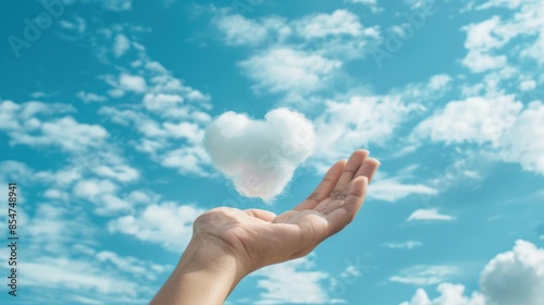 hand holding a cloud shaped like a heart against a blue sky with scattered clouds