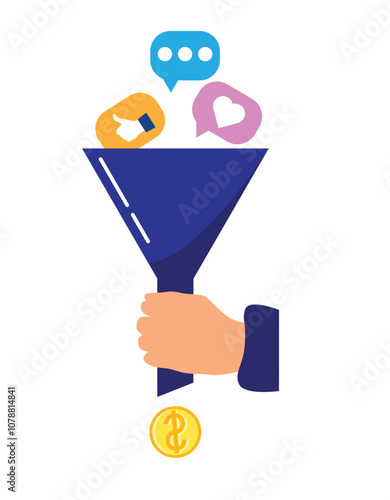 Hand Holding a Funnel which Generates Money from Online Activities. Business, making money and generating sales vector art