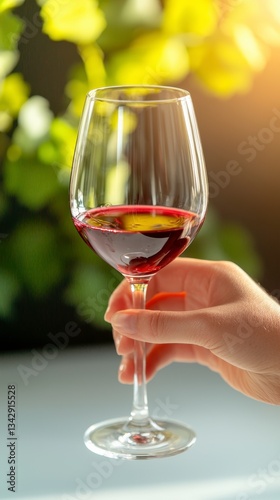 Hand holding a glass of red wine captured in deep focus showcasing the drink's rich color and elegant presentation