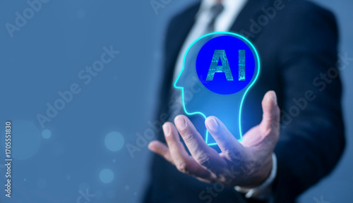 Hand holding a glowing holographic human head with an AI brain, symbolizing future intelligence.