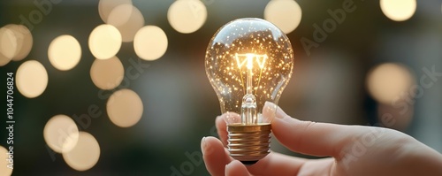 Hand holding a glowing light bulb emitting sparkles, symbolizing innovation and inspiration, warm hues and bokeh background for a magical atmosphere