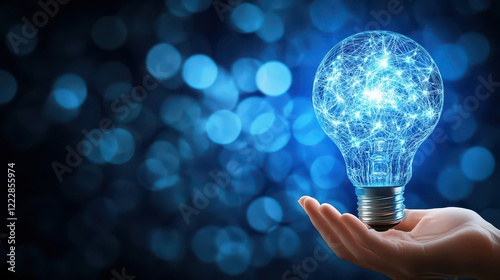 Hand holding a glowing light bulb surrounded by a blue bokeh background, symbolizing innovation