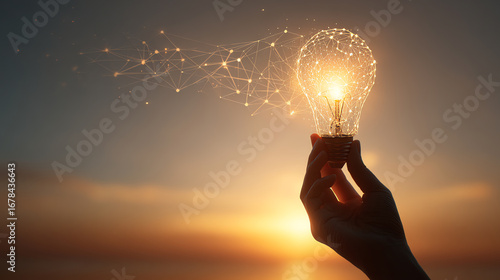 Hand holding a glowing light bulb with interconnected network lines extending from it, symbolizing innovation and ideas against a sunset background