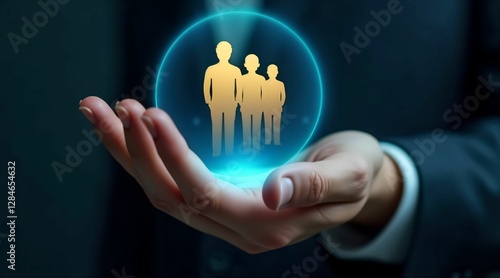 Hand holding a glowing sphere with shadowy figures representing teamwork and collaboration in a professional setting