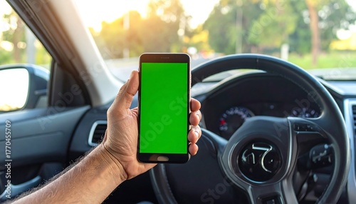 Hand holding a green screen smartphone inside a car with steering wheel and dashboard