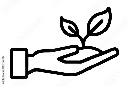 Hand holding a growing plant sprout outline icon on white background seedling