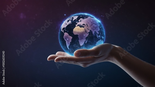 Hand holding a hologram of the Earth against a dark blue and purple background, representing the world map concept for global business technology or environmental protection ideas