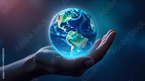 Hand holding a hologram of the Earth against a dark blue and purple background, with a banner providing a space for text, conveying a global business concept idea Generative AI