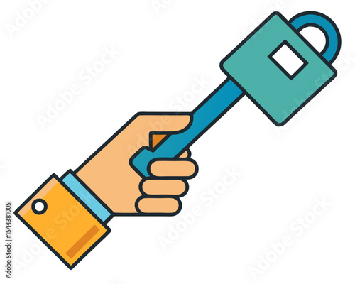 Hand holding a key with padlock silhouette flat design illustration