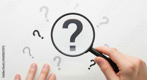 Hand Holding a Magnifying Glass Over a Large Question Mark, Symbolizing Problem Solving, Searching for Answers, and Inquiries on a White Background.