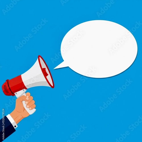 Hand holding a megaphone next to a blank speech bubble on a blue background.
