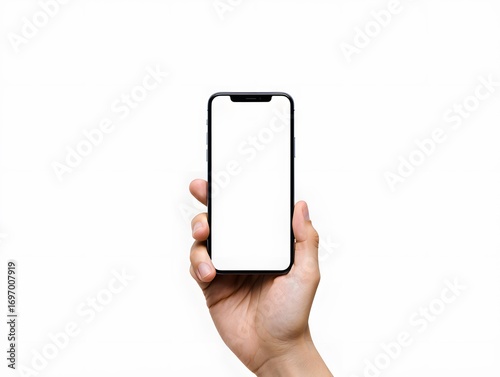 Hand holding a modern smartphone with a blank screen isolated on white background