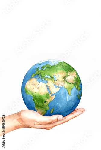 Hand holding a planet in watercolor style on a white background with space for text. World environment day. Earth Day. Geography awareness week