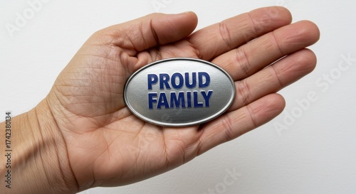 Hand holding a silver oval badge with the words "PROUD FAMILY" printed in blue, against a light background