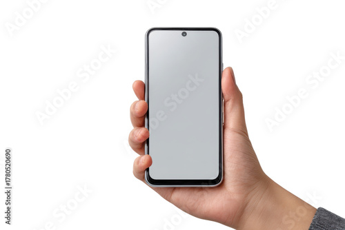 Hand holding a silver smartphone with a blank grey screen against a black background mobile, Png, Isolated on Transparent Background, Cut Out