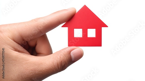 Hand holding a small red paper house model, symbolizing home ownership and real estate investment, with a clean white background emphasizing the concept of housing and property