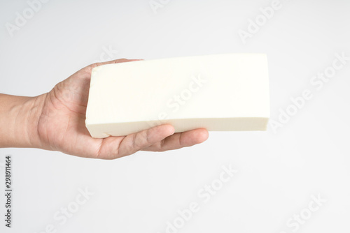 Hand holding a thick cleaning foam sponge
