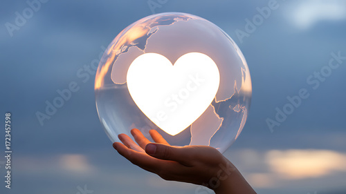 Hand holding a transparent globe with a glowing heart inside against a twilight sky