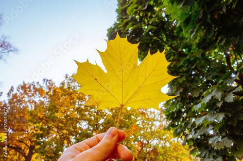 hand holding a yellow autumn leaf