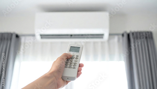 エアコンのリモコンを持つ手。快適な部屋の背景イメージ。Hand holding air conditioner remote control. Comfortable room background image.