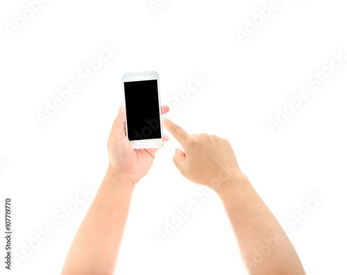 Hand holding and Touch on Smartphone with blank screen isolated