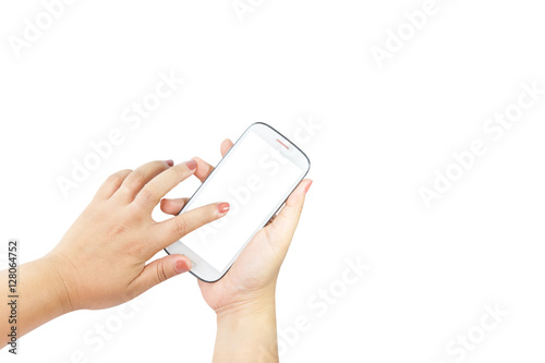 Hand holding big touchscreen smart phone isolated