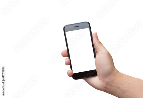 Hand holding black mobile smartphone blank white screen isolated on white background
