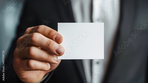 Hand Holding Blank Business Card: Displays a hand holding a blank business card against a gray background, suitable for branding or advertisement purposes.