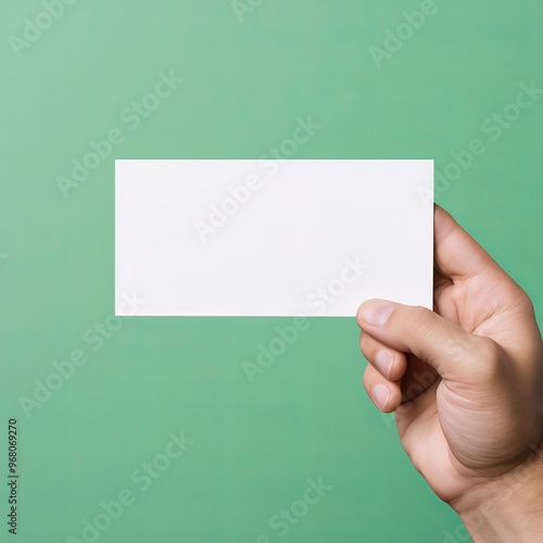 Hand Holding Blank Card Mockup Against Green Background, Generated AI