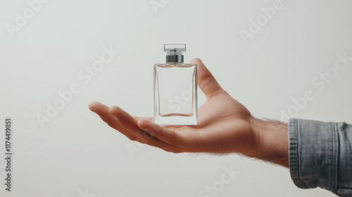 Hand Holding Blank Cologne Bottle Against Plain White Background for Product Display
