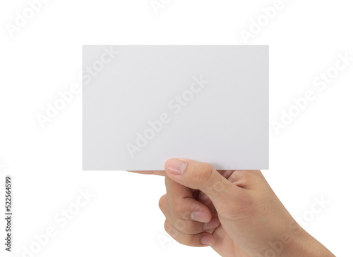Hand holding blank paper, Greeting card mockup.