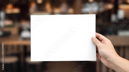 Hand holding blank sheet of paper in a cozy creative space close-up view minimalist environment inviting expression