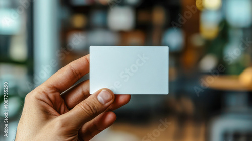 Hand holding blank white business card in indoor office setting