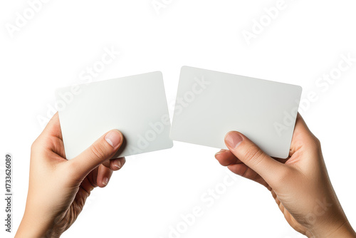 Hand holding blank white credit cards isolated on transparent background. Hand holding bank credit plastic card mockup isolated on white background.