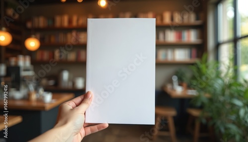 Hand holding blank white paper template in coffee shop. Woman presents book cover design poster or leaflet mockup. Empty space for text or design. Business concept. Reading, education, marketing.