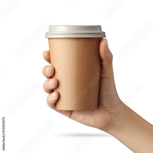 Hand holding brown kraft paper coffee cup with white plastic lid isolated on white background studio closeup of disposable takeaway beverage cup casting soft shadow